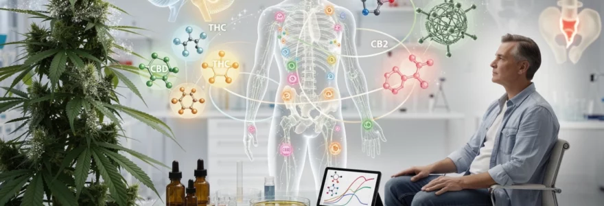 Le tétrahydrocannabinol, principal composé psychoactif du cannabis, agit comme un agoniste partiel des récepteurs cannabinoïdes CB1 et CB2. Son affinité pour les récepteurs CB1, localisés principalement dans le système nerveux central, explique ses effets sur la cognition, la mémoire et la perception sensorielle. La liaison du THC au récepteur CB1 active une cascade de signalisation intracellulaire impliquant les protéines G, inhibant l’enzyme adénylate cyclase et modulant les canaux calciques et potassiques. Cette activation produit les effets caractéristiques du cannabis : euphorie, relaxation, altération de la perception temporelle et stimulation de l’appétit. La concentration plasmatique maximale est atteinte 3 à 10 minutes après inhalation, contre 1 à 6 heures par voie orale.